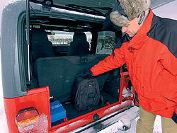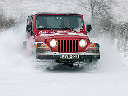 Ferde megközelítéssel simán átjut rajta, közben az utasok szereznek egy-két búbot a fejükre. Úgy kell nekik, miért nem vettek fel sisakot? Pocsék kátyúsorozat következik, mély vízzel, jeges szélekkel, iszapos sárral. Fröcsköl a matéria, a Jeep robog tovább. Amíg elég szilárd a talaj ahhoz, hogy meg ne süllyedjen, fel nem tartóztatja semmi. Motorja, minta dízel lenne, pörögni ugyan nem szeret, de szinte alapjárattól húz. Brutálisan meredek emelkedőkön és lejtőkön érzi magát elemében az autó, lehetőleg térdig érő kemény hóban, de nem ijed meg egy kis oldaldőléstől sem. Ugye, milyen jó az a magas küszöb? Nem folyik be a víz! S milyen jó, hogy vastag szivaccsal burkolták a masszív