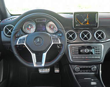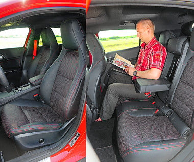 A sportos vonalú, tetszetős GLA-design belül sem okoz csalódást: egyszerű, letisztult, igényesen felépített a műszerfal. Az anyagok, az egyenletes illesztési hézagok nagyon megnyerők. A háromküllős kormány vaskos, jó fogású, a sportülések kényelmesek, egyedül az integrált fejtámaszok zavarók, de nagyon. Az előredőlő fejtámlák meredek támla esetén ugyanis nyomják a tarkót. A családosok nem fognak túlságosan örülni annak, hogy az anyósülésre nem lehet menetiránnyal háttal rögzíthető gyerekülést helyezni. A utasoldali légzsák ugyanis súlyérzékelő alapján, automatikusan működik, manuális, kulccsal történő kiiktatásra nincs lehetőség. A második sorban a férőhely nagysága hozza a kompakt modellek átlagát, de a SUV-mezőnyben a szűkösebbek közé sorolható. Ugyanez igaz a raktérre is, egy 4417 mm hosszú autótól a 421 literes érték nem éppen letaglózó – ennyit nagyjából egy 20 centivel rövidebb Škoda Yeti is tud. A támlák osztva dönthetők, bővítés után (max. 1235 l) nem lesz teljesen sík a padló, a praktikumot sílécalagút és oldalkampók fokozzák.