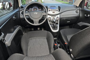 Az i10-esre pillantva semmi jóra nem számítanánk belül, pedig a 3585 mm-es hosszhoz képest meglepetés a kabin mérete. Az autóba egyszerre akár négy átlagos termetű felnőtt is befészkelheti magát, csak a termetesebbeknek lehet széltében szűk az utastér. A fej- és a lábtér a kategóriában jónak számít, a sofőr azonban moroghat a csak magasságában állítható kormány és a nem elég mélyre leengedhető ülés miatt. Rekeszek és pohártartók is jutottak bőven a kabinba, a rádió alatti fióknál nemcsak 12 voltos aljzat, hanem USB-, AUX- és iPod csatlakozó is helyet kapott. Utóbbi szériatartozék, ahogy a 2 DIN méretű, MP3-lejátszós, négy hangszórós CD-rádió is. Dicséretes, hogy ezt egy 2,39 milliós autónál alapáron kínálják! Az már kevésbé örvendetes viszont, hogy a bokamagasságban lévő hangszórók ereje finoman szólva is gyenge, a menet közbeni erős motorzaj miatt a tempó függvényében állandóan hangosítani kell a rádiót.