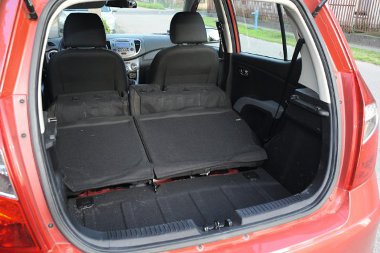 A hátsó támlák osztva dönthetők, ahogy az ülőlapok is, így könnyű sík padlójú rakteret nyerni. A csomagtartó 225 literes, ám 925 literesre növelhető. A hátsó fedél nagy, a berakodást nem nehezítik benyúló karosszériaelemek – speciel egy 93x93x25 centiméteres doboz gond nélkül befért az i10-esbe. A merev kalaptartó felületén kialakított mélyedésekbe nyugodtan pakolhatunk kisebb tárgyakat, az utasülés alatt fiókot, a fejtámlájánál pedig horgot helyeztek el, amire akár háromkilós szatyor is akasztható. Nem praktikus, hogy a kalaptartó a csomagtérajtó nyitásakor nem emelkedik fel, kézzel kell felbillenteni, ha pedig elfelejtjük lehajtani, akkor tolatáskor azzal szembesülünk, hogy eltakarja a hátsó szélvédőt… A terhelhetőség 425 kiló, arra azért ügyeljünk, hogy megpakolva bizony szépen leül az autó hátulja, s bizony könnyen felfeküdhet a járdaszegélyre.