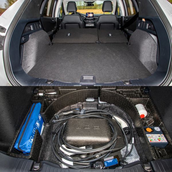 ST-Line felszereltségtől felfelé jár a vetített műszeregység, amelynek grafikája alkalmazkodik az épp használt üzemmódhoz, igaz, a kék szín mindig meghatározó marad. A PHEV-változat sajátja a váltót vezérlő forgókapcsoló mögött elhelyezett EV-kapcsoló, amivel a hajtás üzemmódjai között választhatunk, a teljesen elektromos haladástól az elektromos energiatartalékoláson át a hibrid módig (utóbbira automatikusan átvált az autó, ha lemerül a telep), és van akkumulátortöltési lehetőség is. Utóbbi felettébb energiapazarló megoldás, olyankor éri meg, ha tényleg szükség van az utazás végén pár kilométernyi helyi károsanyag-kibocsátás nélküli haladásra, ilyen behajtási korlátozás per pillanat nincs hazánkban. Egyszerű konnektorról 6 óra, fali töltődobozzal vagy utcai gyorstöltővel 3,5 óra a töltési idő – külön kábel van a két töltési lehetőséghez. Ezzel úgy 50 km-es elektromos hatótávolságot nyerünk kis odafigyeléssel; sztrádatempóra is képes villanymotorral a Kuga PHEV, hiszen 135 km/óra az elektromos csúcssebesség, de ilyenkor nagyon gyorsan pörög lefelé a hátralevő elektromos hatótáv, érdemesebb ilyenkor a benzinmotorra váltani és tartalékolni az energiát az országúti/városi szakaszokra.