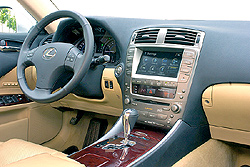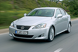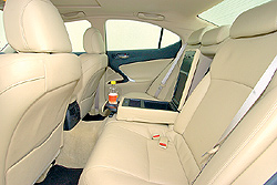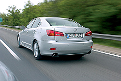 az autókban fellelhető nyolc-tíz alapvető karaktervonás közül melyeket erősítsék, illetve melyeket szorítsák háttérbe. A Lexusnál az IS 250 fürgeségének, kezességének megőrzése, illetve a karosszéria arányainak megtartása érdekében, valamint az IS Lexus-palettán elfoglalt helye miatt egyedül a karosszéria méretei kényszerítenek ki megalkuvást. Ha hátul is utazik valaki, biztos, hogy kevésbé lesz elégedett, mint az elöl ülők. A tér itt jóval kisebb, s az egyébként is kicsi oldalsó üvegfelületek és a hátrafelé emelkedő övvonal miatt az utas még bezártnak is érzi magát. A csomagtartó sem öblös, a közel 380 literes érték inkább kompaktautós, mint középkategóriás – a vonalvezetés harmóniája ebben az esetben fontosabb volt a használati értéknél. A Lexus hátrányai azonban ebben ki is merültek, s bőséggel vannak olyan részletek, amelyek kárpótolnak a hiányosságokért. A fordulatszámmérő különlegessége, hogy amint mutatója közelít a piros tartományhoz, narancsos körív villan fel benne – ennél tapintatosabban és esztétikusabban autó még sosem figyelmeztette gazdáját. Ettől igazán jó a Lexus – egy ilyen finoman ötletes és szépen megvalósított megoldás kedvéért ugyanis az autószerető ember keres magának egy kanyargós utat, ahol egyszerre gyönyörködhet a V6-os suttogó hangjában és a narancssárgában izzó diódasorban. Később persze feltűnik, hogy milyen finom és jól hangolt a rugózás is. Még a fekvőrendőrön is finoman huppan át, ugyanakkor húzósan vett kanyarban sem annyira puha, hogy tartanunk kellene a sodródástól.