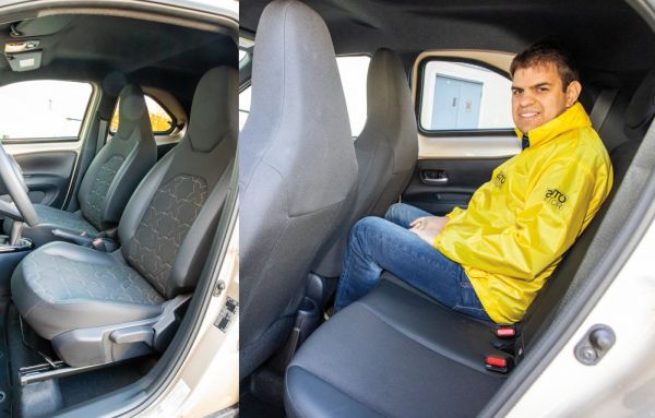 Jó az üléspozíció, de a fix fejtámlás első üléseket érezhetően városi közlekedéshez tervezték. A rövid tengelytáv mellett a túlméretes első ülések miatt szűkös a hátsó sor. Az ablak hagyományosan kibillenthető