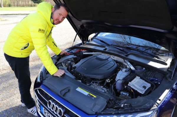 A szélesebb és laposabb hűtőrácsáról, valamint a vagányabb szabású lámpáiról felismerhető típus alapmodelljét 1,4-es turbómotor helyett immáron 2,0 literes blokkal látják el, mindezt pedig megfejelték egy szíjhajtású indítógenerátorral, amely 5 kW-os teljesítménnyel támogatja a benzinmotor munkáját. A rásegítéshez a csomagtérben lévő 12 voltos, 10 Ah-s lítium-ion akkumulátor tárolja a szükséges áramtöbbletet. Gyorsítás közben semmit sem lehet érezni a lágyhibridségből, ugyanakkor a start-stop vezérlése már nagyon korán lelövi a motort, és olyan finoman és gyorsan indítja újra, amire eddig nem volt példa az A4-eseknél. Bár a 150 lóerő miatt nem beszélhetünk ülésbe préselős gyorsulásról, nagyon kellemes a hosszában beépített, 2,0 literes benzinmotor karaktere: már 1350-es fordulattól lehívható a nyomaték, vagyis nem kell pörgetni a haladáshoz. A hétgangos S tronic váltó ugyan kicsit izgágán kapcsolgat, a vezérlés nagyon alacsonyan tartja a fordulatot, állandó tempónál, sík úton 1100-on is tud pihenni a motor.