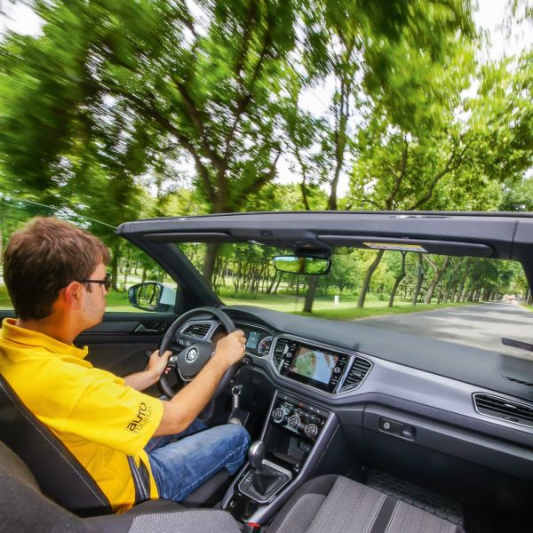 Négy évvel ezelőtt búcsúzott a vászontetős Golf, amely most fél emelettel magasabban tér vissza: továbbra is az MQB építőkészlet az alap, de a T-Roc kabrióba kényelmesebb a ki- és beszállás. A messze hátranyúló szélvédővel és felhúzott oldalablakokkal még szélfogó (115 570 Ft) nélkül is egészen jó a szélvédelem az első sorban. A szélfogó egyébként használaton kívül a csomagtérpadló alatt utazik, behelyezése kétemberes feladat. Hátul már borzolja a frizurákat a menetszél, de dicséretes, hogy csukott tetőnél is van elég fejtér, a lábak viszont a padló merevítője miatt nem férnek be az első ülések alá. Menet közben 30 km/órás tempóig lehet működtetni a tetőt, illetve a kulcs nélküli bejutás rendelésekor erre távirányítóról is lehetőségünk van. Az analóg műszerek és a köztük lévő multifunkciós kijelző mindig jól leolvashatók ugyanez nem mondható el a Discover Media (396 240 Ft) navigáció képernyőjéről, amely erős fényben a csillogás miatt nem látható.