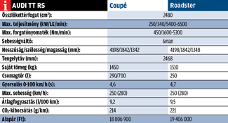A fémszínű tükörház és a nagyobbra tátott alsó ajak is az RS ismertetőjegyei közé tartozik A TT RS rettenetesen sokáig fogja az utat, mielőtt finoman alulkormányzottá válna, s az orra elkezdene letérni az ívről. Terhelésváltásra (gázelvétel, ráfékezés) a kocsi hátulja is bekapcsolódik a játékba, és az elejét újra irányba állítja. Versenypályán kimondottan élvezetes ez a fajta viselkedés, szűk hegyi szerpentinen viszont csak a gyakorlott vezetőknek javasolt teljesen kiiktatni az elektronikus őrangyalt. Már csak azért is, mert az Audi TT RS nem éppen olcsó játékszer, alapára közel 19 millió forint.