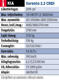 2.2 CRDi: mindössze 6,5 l/100 km-es átlagfogyasztást ígérnek a gyáriakA korábbi 2,5-ös (170 LE) blokk helyét egy új fejlesztésű, kisebb lökettérfogatú 2,2-es vette át, amely erősebb elődjénél. A 197 lóerős teljesítmény mellé 421 Nm-es csúcsnyomaték társul, mely bődületes erővel tudja megindítani a Sorentót. Manuális váltóval és elsőkerékhajtással 9,4 másodperc alatt terem százon a több mint 1,7 tonnás Kia, a végsebessége pedig 190 km/óra. A fejlesztések során a leváltott modellhez képest javítottak a légellenálláson – 0,42 helyett csak 0,38 a cW érték –, és faragtak az autó súlyából is 215 kilót. Az önhordó karosszéria és az új, 10 mm-rel lejjebb került felfüggesztések javítottak a Sorento országúti viselkedésén, az autó súlypontja 54 mm-rel alacsonyabbra került. Az első felfüggesztéseket MacPherson rugóstagokra cserélték, a hátsókat pedig független, több lengőkarosra, amely egy segédalváz-kerethez csatlakozik. Persze, ezektől nem lett sportautó a Sorentóból, de országúton nagyobb sebességnél magabiztosabbá vált az autó egyenesfutása, kanyarban mérséklődött az oldaldőlés, s a Kumho gumik lecserélésével tovább lehetne még javítani a stabilitáson. A rideg, négy évszakos Kumho abroncsok forszírozott tempónál hamar elveszítik tapadásukat, s az autó lecsúszik a kijelölt ívről. Az „aszfaltbarát” kialakítás hátránya, hogy a feszesebb rugózás terepen pattogóssá teszi a Sorentót, mondjuk a 184 mm-es szabad hasmagasság miatt eleve nem beszélhetünk komoly dagonyázóképességről.