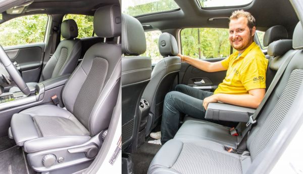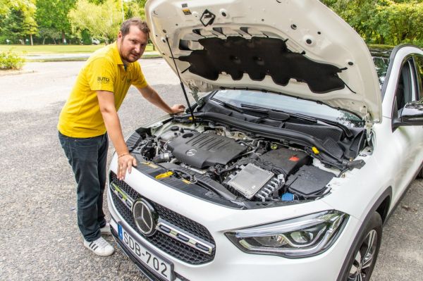 A kissé esetlen külső már a múlté, arányos, jó kiállású autó az újdonság, amely ugyan 1,4 centivel kurtább elődjénél, de három centivel szélesebb és tízzel magasabb. Ezek után természetes, hogy a fejtér jelentősen nőtt, 190 centis magassággal is jól el lehet férni hátul – még úgy is, hogy a panorámatető sok helyet rabol! Szóval meglepően tágas az újdonság, és ha árnyalatnyival puhább tömésűek lennének az ülések, gyakorlatilag ugyanazt a komfortot hozná, mint a nagyok. Aztán ahogy elkezdi az ember felfedezni a belteret és az egyes funkciókat, világossá válik, hogy nem spóroltak semmin. Manapság, amikor már a legtöbb autóban a hűtővíz hőfokjelzőt is elhagyják, itt még a váltóolaj hőfokát is előhívhatjuk a tűéles és szinte végtelen konfigurációs lehetőséget adó kijelzőről. De említhetjük a kormányon lévő érintésérzékeny kis felületeteket, vagy akár a hangulatvilágítást, amelyek mind gondos munkáról árulkodnak. Egyvalami lóg ki az összképből: a kormányoszlopra helyezett előválasztó kar olcsónak hat ebben a környezetben. A kütyü- és techmániás fiataloknak persze maga a mennyország a GLA, az MBUX-rendszer hangvezérléssel utasítható, a navigációja pedig elképesztő. Kereszteződésnél vagy körforgalomba érve virtuális (saját maga által létrehozott) táblákkal mutatja a menetirányt. Zseniális, mert gyakorlatilag lehetetlen elhibázni a kihajtókat! Az is érdekes, hogy ami pár éve szenzációszámba ment az E-osztálynál, azt ma már egy GLA is tudja, hiszen indexelésre sávot tud váltani gyorsforgalmi úton. Én személy szerint nem várom az önvezető autók korát, de elismerem, hogy bámulatosan dolgozik össze a sávtartóval és az adaptív tempomattal.