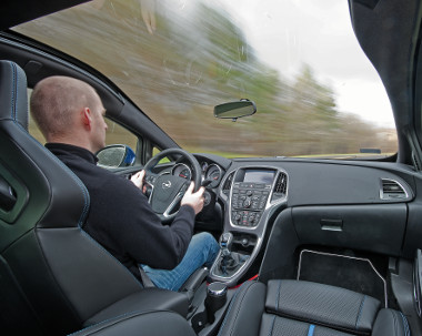 Az utastér ötszemélyes ugyan, de hátra nem egy leányálom bemászni, a passzentos helykínálat és a lőrésszerű ablakok miatt pedig az utasoknak bezártságérzete lehet. Persze az Astra OPC amúgy is a vezetőülésből igazán vérpezsdítő: a Recaro kagylóülésekre (fűthetők, az ülőlapon és a háttámlán is szabályozható oldaltámasszal) elég ránézni, hogy az egekbe szökjön az ember pulzusa. Ezenkívül 360 mm átmérőjű, alul lapos multifunkciós sportkormány, masszív váltógomb, alumínium pedálsor és karbonutánzatú dekorelemek emelik a hangulatot, nem is beszélve az első utasok mögé nyúló panoráma-szélvédőről, ami ragyogó kilátást nyújt. Legalábbis felfelé, merthogy a vaskos és meredeken döntött A-oszlop nagyon sokat kitakar. Jómagam épp a kanyar csúcspontját nem láttam rendesen, ami egy ilyen telivér gépnél szerpentinen és versenypályán sem lenne hátrány.