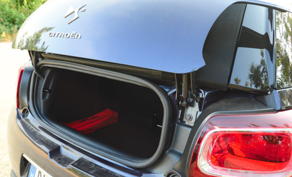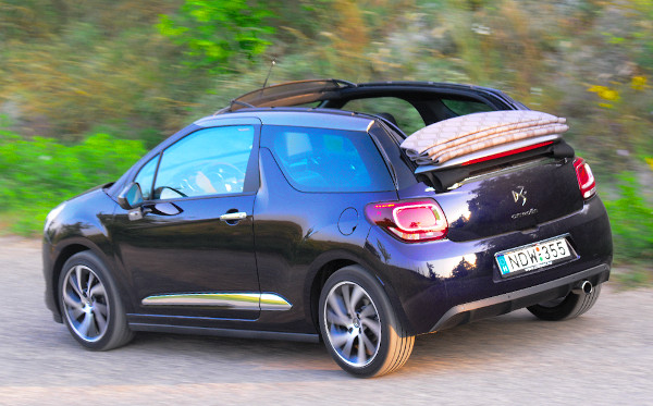 A Citroën mérnökei megtartották a karosszéria oldalfalait, annyi extrát találtak ki, hogy az üveg hátsó szélvédő is lebukik, ha megismételt gombnyomásra teljesen hátratoljuk a tetőt. Ez már csak azért is ajánlott, mert megszabadulunk a hangosan, dobhártyaszaggató módon csapkodó légörvényektől. A hátragyűrt tető egyfelől teljesen ellehetetleníti a hátralátást, cserében szélfogóként szinte teljesen huzatmentes utasteret valósít meg mind a két üléssorban. S a DS3-as belsejében a kicsit nehéz hátrajutást követően igenis tisztességes méretű teret találunk még a második sorban is. Ennél nehezebb dolga van az embernek a csomagok raktérbe juttatásával, nevetséges a csomagtérnyílás mérete. A hosszú áttételezésű váltó ellenére egészen sportosan lehet közlekedni az autóval, és úthibákon áthajtva sincs az az érzése az embernek, hogy rögtön összecsuklik a karosszéria.