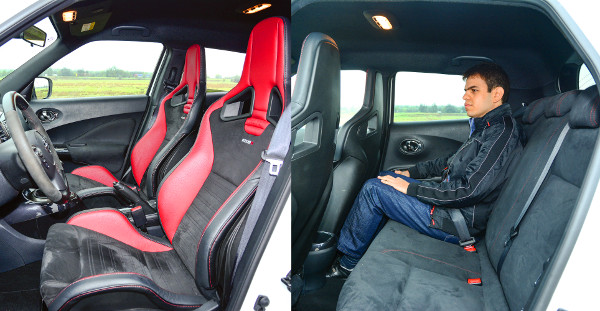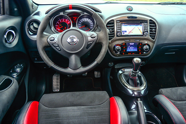 A beltérben kemény műanyagok és Alcantara váltják egymást, kedves részlet a kormány piros közép állás jelzője, a fordulatszámmérő színben passzoló háttere, vagy az elszórt Nismo logók. Rájuk pillantva többé nem kifogásoljuk darabosságát, inkább örülünk, hogy a vékony Recarók miatt nagyobb a hátsó lábtér, a duplafenekűre bővített csomagtartóba pedig több holmi fér. Az sem mellékes, hogy az 1,6 literes, turbós benzines élénk használat mellett sem fogyasztott 8,7 liternél többet, így legalább elég egyszer sokat költeni a legvadabb utcai Juke-ra.