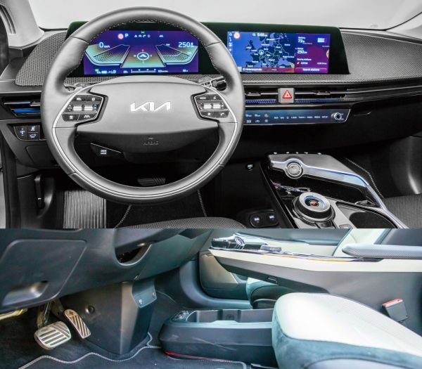 A 11 típus közül 7, köztük az EV6-os is a kifejezetten villanyautók számára készített E-GMP alapra épül, ám a modell önmagában az újszerű külső miatt is érdemes a figyelemre. A 4,7 méter hosszú, crossoveres beütésű ötajtós formáját úgy tudnám tömören leírni, hogy emészthetően futurisztikus. Első pillantásra is látszik rajta, hogy nem egy hagyományos autó, a far kialakítása tanulmánymodelleket idéz, és bizony az erőteljes kerékjárati ívek is jól állnak neki. Műszaki rokonához, a Hyundai Ioniq 5-öshöz képest lágyabb és simulékonyabb a megjelenése, ám a Kia is tömzsinek, masszívnak hat, hasmagassága alig marad el a Sportage-étől. Vaskosak a küszöbök is, amivel nem is lenne baj, az viszont rögtön feltűnik, hogy az üléspozíció nem kedvez a magasabb termetűeknek – az ember ölében van a kormány és a körkilátás sem éppen megfelelő. Szerencsére az üléskomfortra és a praktikus részletekre sem lehet panaszunk. A tárolórekeszek száma átlag feletti, az első ülések közötti lebegő konzol pedig zseniális, hiszen egyrészt növeli a térérzetet, másrészt az alsó rész rengeteg holmit képes elnyelni. Bár a felhasznált anyagok zömében egyszerűek, a belső a nagy képernyők és a minimalista berendezés ellenére is otthonos, ráadásul a kezelhetőségre nem lehet panasz, a hőfokot hagyományos tekerőgombbal szabályozhatjuk.