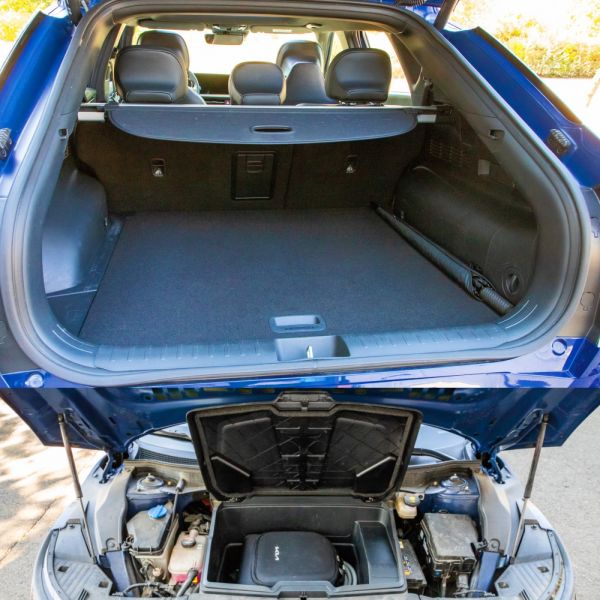 Mivel az EV6-os tengelytávolsága 2,9 méteres (akkora mint egy Volvo S90-esnek) a hátsó lábtér hatalmas, akár keresztbe tett lábakkal is utazhatunk. Az már más kérdés, hogy a fejtér legfeljebb átlagos, a magas padló miatt az üléshelyzet is eltérő ahhoz képest, mint amit egy hasonló méretű, hagyományos autóban tapasztalhatunk. A 490 literes raktér önmagában is dicséretre méltó egy elektromos modellnél, de azért külön elismerést érdemelnek a konstruktőrök, hogy a töltőkábeleknek az autó orrában alakítottak ki helyet. Vagyis ha tele van a csomagtartónk, nem kell mindent kipakolni, hogy hozzáférjünk a kábelekhez.