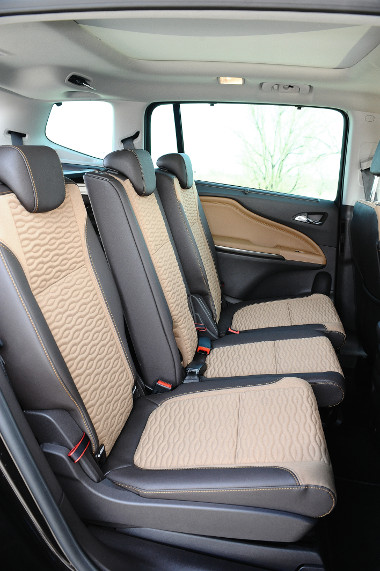 A Zafira Tourer kabinja briliánsan variálható, elöl a komfortos, gerincbarát, jól formázott ülésekben 600 kilométer megtétele sem jelent kihívást. A könyöklő alatt mély, több szintes tárolórendszer található. A második sori ülések 35:30:35 arányban egyenként tologathatók, billenthetők, dönthetők. A két szélső ülés a középső eltüntetése után akár beljebb is rögzíthető, így valóban pazar az üléspozíció.