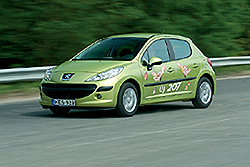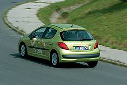 Városban olyan könnyű, hogy akár egy ujjal tekerhető, a sebesség emelkedésével viszont kellően bekeményít. Így aztán a visszajelzéseket sem hiányoljuk annyira, egészen pontosan irányítható a kocsi. Örömömre szolgált az is, hogy az ötfokozatú sebességváltó megvezetése lényegesen határozottabbá vált. Igaz, a járása picit még mindig akadós, a kapcsolási utak pedig lehetnének rövidebbek, de sokkal kellemesebb használni, mint a korábbi darabot. Ráadásul annak ritkábban lesz része ebben, aki a tesztelt 90 lóerős turbódízel motorral választja autóját. Az 1,6 literes HDi nem sokáig lazsál: 1500-as fordulatszám alatt még félgőzzel dolgozik, kicsivel feljebb viszont teljes erőbedobással munkához lát. Lendületesen gyorsít a 207-es, de nem olyan fürge, mint várnánk. Ez részben az egyenletes teljesítményleadásnak tudható be, részben az indokolja, hogy a 206-oshoz képest alaposan meghízott (kb. +150 kg) az autó. Szerencsére a fogyasztás még ezzel együtt is kedvező – a tesztünk során mért 6,1 literes átlaggal számolva a hatótávolság 800 kilométer feletti! Igazság szerint a nyugodt autózás közelebb áll a Peugeot-hoz: nyomatékosságának köszönhetően gyorsan felkapcsolhatunk, s a legtöbb forgalmi helyzetet úgy is megoldhatjuk, hogy nem nyúlunk a váltókarhoz. Hosszabb kiruccanásokra is kellemes társ a 207, a motor szelíden duruzsol a háttérben, autópályán pedig a 130-140 km/órás utazósebességről még meggyőzően húz a kocsi.