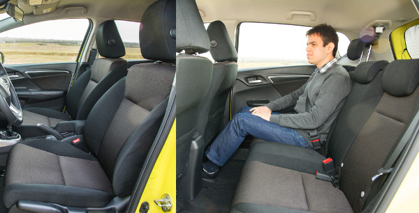 Másodszor gondolta újra a Honda a Jazz koncepcióját, de láthatóan nem mertek eltávolodni a jól bevált megoldásoktól. A karosszéria felépítése kísértetiesen emlékeztet az eredeti, 2001-es modellére, külseje feltűnőbb és modernebb, mint korábban. Arányairól, stílusáról felismerhető, bár szépnek továbbra sem mondanám, cserében már az ajtónyílásai is a jó helykihasználásra utalnak. Szélesre tárhatók, így nem csak a beszállás, a gyerekülések beemelése is könnyebb. Méretes a csomagtérajtó is, mélyről nyílik, pereme alacsony, bepakolni szinte öröm. Akárcsak a hátsó sorba, ott a legendássá vált ülésmozgatási lehetőségek (padlóba rejthető második sor, egy mozdulattal felhajtható ülőlapok) egyszerűsítik az életet, nem is szólva a kategóriában ma is elsőrendű térkínálatról. Akkora itt a hely, hogy azt az első sor sem tudja utánacsinálni, az üléseket egyszerűen nem lehet eléggé hátratolni. 175 cm-es magasságommal kihasználtam a sín osztásait. A vezetési pozíció inkább sportos, mint kényelmes, könyökölni egyik oldalon sem lehet, hiába képezték ki a felületeket, ahhoz mélyen vannak. Hasonló a helyzet a kilátással is, a nagy üvegfelületek panorámáját megtörik a vaskos oszlopok.