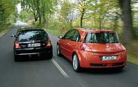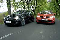 Clióval sokkal könnyebb pontosan és jól fékezni. Ahhoz, hogy elsőkerék-hajtásuk ellenére a temérdek lóerőt talajra tudják vinni, a mérnökök rengeteget változtattak a két autó futóművén és elektronikai rendszerén. A Clio RS megnőtt tengelytáv és szélesebb nyomtáv mellett keményebb rugókat és hátsó stabilizátort kapott, ráadásul a tesztautóban is megtalálható opciós sportfutómű további hasmagasság-csökkenést és kormánygeometria-változást hozott. A Mégane Sport – a többi Mégane-változattal ellentétben – módosított MacPherson rendszerű, a rugóstagtól független függőcsapszeg-tengelyvonalú első futóművet kapott, amivel az első kerekek geometriája pontosabban kontrollálható, s csökkenti a hajtási befolyást. Elöl és hátul is szélesedett a nyomtáv, s feszesebb lett a rugózás-lengéscsillapítás karakterisztikája. Úttartását tekintve mindkét autó „tízpontos”, de a Clio a kezesebb, mozgékonyabb, a városban szinte nincs ellenfele. Kikapcsolt ESP-vel nem a kezdők autója, ahhoz a feszes rugózásnak és a rövid tengelytávnak köszönhetően túlságosan is élénk a hátulja. Egyébként is, ezzel az autóval lehetetlen ellazultan közlekedni, szinte minden kanyar egy újabb meghódítandó cél. Ezzel ellentétben a Mégane egy igazi hosszútávfutó, autópályán, országúton fölényesen uralkodik, de lehet vele lassan is menni. A Clióhoz képest kényelmes rugózás és a csendes utastér néha legalább olyan fontos, mint egy élményteli szerpentinautózás. Útfekvése elsőrangú, ám itt az ESP csak 50 km/óráig kapcsolható ki, így helyettünk az elektronika oldja meg a határhelyzeteket, szerencsére elég semlegesre hangolták, így az autó nem szenved kóros alulkormányozottságban.