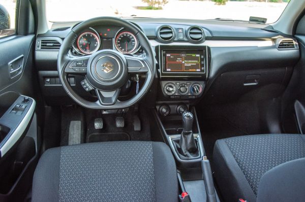 A vezetési helyzet egyetlen negatívuma a Minihez hasonlóan meredek és kicsi szélvédő, a lámpánál emiatt előre kell hajolni, egyébként nincs gond a kilátással, a nem aszferikus és nem is túl nagy tükrökből sem probléma a manőverezés. Hátra látni nem könnyű, de nem is vészes a vezetőülésből, csak a vastag C-oszlop rontja az esélyeinket. Jó az ergonómia, a manapság még egy viszonylag fapados modellből is kihagyhatatlan (a GL alapmodell nem tartalmazza) érintőképernyő érzékenysége és optimális kezelőfelülete is kényelmessé teszi a használatát, a hangerőszabályzást azonban jobb a kormányról intézni. Az Info gombbal a fedélzeti komputer adatai között is szörfözhetünk, nem kell a műszeregység melletti pöcköt nyomkodni. Nem sok információt dörgöl az orrunk alá, a többfunkciós, színes kijelzőért a GLX-szintet kell választani. Mégsem érdemes sokat költeni a Swiftre, mert amiben jó, azt az alapváltozat is tudja.