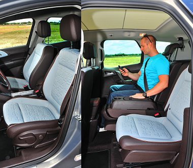 Az első sorban helyet foglalva sok újdonsággal nem találkozunk. Továbbra is temérdek gomb, kapcsoló tereli el a sofőr figyelmét a vezetésről, azonban az ósdi grafikájú navigátort lecserélték. Az új multimédiás, navigációs IntelliLink fejegységhez immár tolatókamera (50 000 Ft) is csatolható. Az igényesebb megjelenésű navigációhoz választható magyar menünyelv, a címbevitel azonban a forgókapcsolós, tekerős megoldás miatt lassú. Áttervezték a FlexRail első könyöklő/tároló szerkezet sínrendszerét, így az kevésbé nyúlik be a hátul, középen ülő lábterébe. A csúsztatható, kivehető könyöklő alatt pohártartók és egy öblös rekesz találhatók, de a különböző szintek mozgatásakor azok rögzítő mechanikája érzésre nem tűnik éppen örökéletűnek. A második sorban a panoráma-üvegtető (200 000 Ft) dacára is kellően tágas a hely, azonban a lyukacsos árnyékoló tűző napsütésben gyengén sötétít. A hátsó ülések tetszés szerint alakíthatók, sínen tologathatók, meredek vagy fekvős támlapozícióba állíthatók, valamint síkba dönthetők. A csomagtartó 400 literes, mely az ötfős kabin megtartása esetén is könnyedén bővíthető. A padlóban masszív fémszemek találhatók, melyekhez rögzíthetők például a poggyászháló horgai.