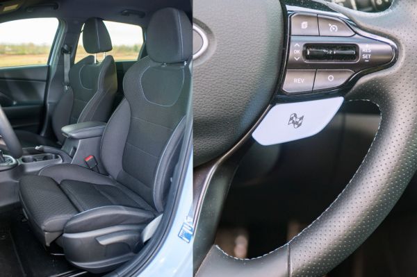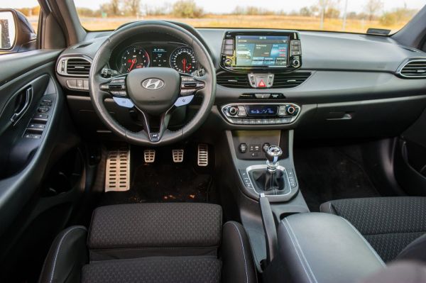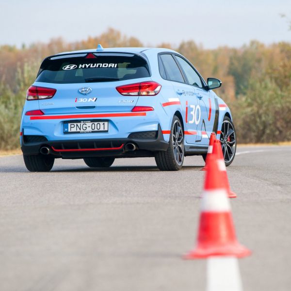 Apró makula volt a tesztprogramban, hogy mi már téli abronccsal kaptuk meg az i30 N-t, ami 20 °C feletti nappali hőmérséklet mellett rosszul tapadt. A 0-100 km/órás gyorsulás inkább füstbe ment, mint előre, és N-módban egy-egy komolyabb gázadásra is csak kipörgő kerék volt a válasz gyorsulás helyett. Azt azonban érezni lehetett, hogy többre hivatott ez az autó, pontosan irányítható, jól adagolhatók és hatásosan lassítanak a fékek, és ahogy az a forró ferdehátúak között lenni szokott, könnyen táncba vihető a hátsó tengely. Külön gombot kapott a kormányon az N-mód, amikor engedékenyebb lesz az elektronika, érzékenyebb a gázpedál és hangosabbra kapcsol a kipufogó – legalább valami képes elnyomni a téli abroncsok gördülési zaját… –, de sajnos a felfüggesztés is bekeményít. Utóbbi már túl sok a magyar utakon, ha ugyanis nem tükörsima az aszfalt, nagyon ráz az autó, kanyarban pedig még az ívről is lepattog. Normál módban egyébként a körülményekhez, vagyis a peres abroncsokhoz képest egész jó a rugózás; a 25 ezer kilométerénél járó tesztautó meglepően egyben volt, semmi nyikorgás nem hallatszott, ami dicséretre méltó teljesítmény egy ilyen, feszes hangolású, rövid idő alatt sokak által nyüstölt kompakttól. A váltó is jól átvészelte a megpróbáltatásokat, pontosan megvezetett, rövid utakon jár a kar, az egyik legjobb része az autónak. Nem tetszett, hogy a vezeték nélküli töltő (35 000 Ft) egyfelől nem tartja megfelelően a készüléket, másfelől használata lefagyasztotta a telefont. Ezzel ellentétben az első kagylóülések igenis szorosan tartják a testet. Az ülőlap kemény oldaltámaszai a hozzám hasonló alkatú embereknek fájdalmassá teszik a több száz km-es túrákat, de a vetélytársaktól eltérően kellően alacsonyra építették be ezeket, ami piros pontot érdemel.