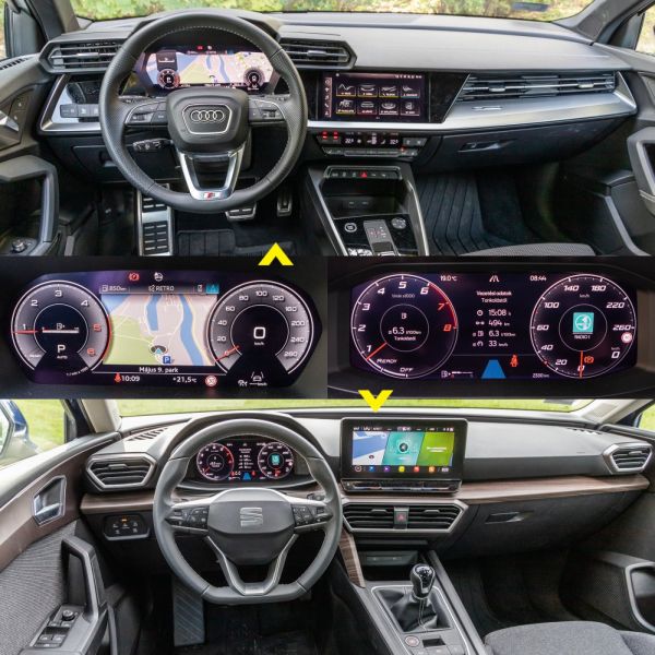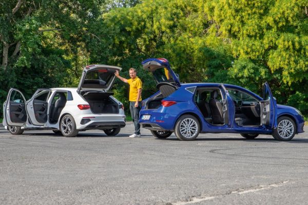 Ami a műszaki hátteret illeti, a motorok és váltók palettájáról többé-kevésbé szabadon lehet mazsolázni. A magyar importőr kínálata a Seat esetében gazdagabb az Audiénál, a Leonból létezik ugyanis egy 1,0 literes, 90 lóerős benzines belépőmodell, ezzel szemben az A3-as a szintén 1,0 literes, de 110 lóerős kivitellel indít (30 TFSI). Hatfokozatú kézi váltóval kombinálva ezzel a motorral 1 027 430 Ft-tal kerül többe az Audi, jelenleg további 1 000 001 Ft-os kedvezménnyel teszi elérhetőbbé a Seatot a Porsche Hungaria. Hétfokozatú duplakuplungos váltó választása esetén a Leon nem az alap Reference, hanem a Style felszereltségi szinttel és 7 700 569 Ft-os árcédulával érkezik, ez a lágyhibrid hajtáslánc az A3-as esetében 9 112 050 Ft-ba kerül. A 2,0 literes dízelmotort csak a Seatnál lehet hatfokozatú kézi váltóval párosítani (az Audihoz nem is kérhető a 115 lóerős változat), ennek alapára 7 955 149 Ft. Az A3-assal közös, 150 lóerős 2.0 TDI a hétfokozatú duplakuplungos váltóval 9 192 129 Ft-tól, az A3-as esetében 10 824 590 Ft-tól választható. A négykarikás kompaktot a márka múltjából adódóan a hozzá jobban passzoló gázolajossal, spanyol testvérét pedig a 130 lóerős 1.5 TSI turbós benzinessel és hatfokozatú kézi váltóval teszteltük.