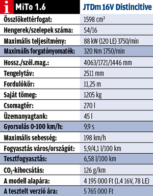 Zongorázni lehetne a különbséget a normál és a dinamikus állás között! Csak az utóbbiban jön át a MiTo ugrásra kész dízelmotorjának ereje, harapóssága és a 9,9 másodperces százas gyorsulása. A hatfokozatú váltó révén autópályán is csendesen suhan az olasz, de a kapcsolási pontosság lehetne precízebb is. 130 km/óránál mindössze 2500-as fordulatszámon dolgozik hatodikban az 1,6-os, ilyenkor erő és nyomaték is akad bőven. Kicsit furcsa egy pöttöm Alfáról azt állítani, hogy sokkal otthonosabban mozog pályán, mint városban, de a 120 lóerős dízel MiTo esetében ez mégis így van. Lakott területen zavaró az alacsony fordulaton jelentkező nyomatékszegénység, a motor karakterisztikája meglehetősen szerencsétlen – 2000 alatt totális rugalmatlanság tapasztalható. Az 1205 kg önsúlyú autó 6,58 liter gázolajat gurított le a torkán 100 kilométerenként, így az egy tankolással megtehető távolság körülbelül 650 km.