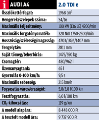 A 2,0 literes, közös nyomócsöves befecskendezésű turbódízel vezérlőelektronikáját is a takarékossági programhoz igazították. Emiatt a motor 143 helyett 136 lóerőt teljesít, a 320 Nm-es maximális forgatónyomaték azonban változatlan maradt. A hatfokozatú manuális sebességváltó 5%-kal hosszabb végáttételt kapott, így azonos sebességnél kevesebbet forog a főtengely, ami előnyös hatással van a fogyasztásra. Az ígéretek szerint a start-stop rendszerrel, fékenergia-visszanyeréssel és intelligens generátorral megspékelt Audi A4 „e” modell átlagfogyasztása 4,6 l/100 km, ami félliteres megtakarítást jelent a normál 2.0 TDI változathoz képest. Hát akkor lássuk, mi igaz ebből a gyakorlatban!