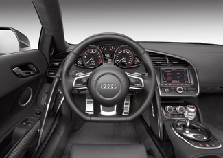 Kicsit odébb leállok és körbegusztálom én is – jó, mondhatni privát peep-show-t rendezek magamnak, mert imádom ezt a formát. Nem csodálom, akad olyan, akit annyira megigéz, hogy 50 milliót is bedobál rá magának… De egy szupersportautót amúgy sem lehet normál mércével mérni, így nyugodtan lehetek szubjektív. Miután képbe helyeztem magam, belül is rendet teszek – ez az ülésállításra éppúgy igaz, mint a fejemre. Bármennyire is az ujjaimban van a versenypályák tempója, azért több mint 500 lóerő utcai forgalomban nem ugyanaz. Nem jobb, nem rosszabb, csak más. Alacsonyan ülsz, kevesebbet látsz, az egész sokkal bezártabb, intimebb, mint egy hétköznapi autóban. Már eleve megharcolsz a bejutásért, le a földre, fejet oldalra, a kéz kapaszkodót keres, aztán puff, be a durván kagylósított bőrülésbe. De ez egy olyan szertartás, ami nélkül nincs sportautó – valamit valamiért. Bent minden nagyon audisan rendezett, a gyári logikát követi, persze megspékelve a 360-ig skálázott sebességmérő és a virító V10-es felirat látványával, na meg a versenyautósan lapított aljú kormánykerékkel.