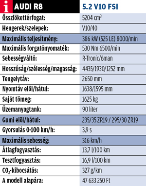 Tényleg, tempó: 316 km/óra – inkább elképesztő katalógusadat, mintsem kihasználható képesség, de ettől ez minden idők leggyorsabb Audija. 0-100 km/óra: 3,9 másodperc, 0-200 km/óra: 12 másodperc – garantáltan a vidámparkban érezzük magunkat. Persze 50 millió forint egy kétszemélyes autóért nem racionális döntés kérdése, de a megcélzott vásárlói rétegnek nem is lényeges. Mostantól az Audinak is van Ferrarija…