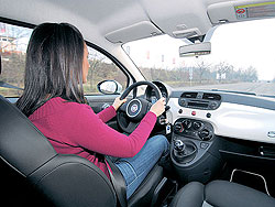 A minőség rendben van, szolid a kidolgozás. Nagyon jól bejön mindenkinél a kissé retro, mégis modern design. A matt fekete volánközép azonban festett alumínium, amely minden odafigyelésünk ellenére egyből megkarcolódott – apró hajszál a levesben. Mivel manapság annyi autós használ navigátort, illene gondolni erre, s közel helyezni egy dugaljat a szélvédőhöz – a Fiat 500-asé lenn van a padlónál, idétlenül hosszan kígyózik hozzá a tápkábel. Az ajtózsebek aprók, a nyitott kesztyűtartó is, egyéb rakodási lehetőség szériában nemigen akad – viszont a tesztkocsiban volt utasülés alatti rekesz (10 ezer Ft.), ami nagyon praktikusnak bizonyult. Sminktükör csak jobboldalt van – no de kedves tervezők, ez egy divatautó!