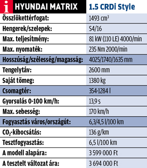 Míg az elődben háromhengeres, 1,5 literes dízel kelepelt, az új modellben már négy dugattyú dolgozik, ugyanekkora lökettérfogaton. A teljesítmény jelentősen, 82 lóerőről 110-re emelkedett, ami a gyakorlatban azt jelenti, hogy a közös nyomócsöves motor dinamikusan is tudja mozgatni a Matrixot, de csak akkor, ha a fordulatszámot 2000 felett tartjuk. Ez alatt ugyanis igen vérszegény a motor, s ha alacsonyan kapcsolunk fel, a turbólyuk egyszerűen felemészti a lendületet. Az erőforrás hangszigetelését komolyan vették, halkan, tolakodó morajlás nélkül dolgozik a CRDi. Csupán autópályán jönne jól egy hatodik fokozat, az tovább csökkenthetné a zajszintet és az általunk mért szerény, 6,5 literes átlagfogyasztást. A Matrix vezetése tulajdonképpen semmilyen meglepetést nem tartogat, a futóműben viszont kellemesen csalódtam. Mivel családi autóról van szó, a lágy csillapítás sokszor előny: a gödröket és útegyenetlenséget magabiztosan lépi át, s komfortos rugózást biztosít maximális terhelés mellett is (550 kg).