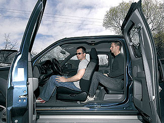 Pedig az RX-8-as stílusában, egymással szemben nyíló ajtók roppant hatásosak, nagy tetszést arathatnak. Éppen ezért kár, hogy a BT-50-es formaterve a „laposabbak” közül való. Mivel a B-oszlopot elhagyták, könnyebb beszállni hátra, de a két sámlival egyenértékű pótszék csak végszükség esetén alkalmas személyszállításra. Noha itt is hárompontos övek találhatók, fejtámla nincs, úgyhogy belegondolni is rossz, hogy például egy ráfutásos balesetben milyen sérülést szenvedhetnek az itt helyet foglalók… Végül úgy alakult, hogy egy törékeny hölgyismerősöm mégis végigkuporogta hátul a Miskolc–Budapest távolságot – hát, nem volt őszinte a mosolya, amikor kiszállt. Legfeljebb azt tudom elképzelni, hogy a földbirtokos úr a gyümölcsös egyik végéből a másikba átviszi „jómunkásemberét”. Hasznosabb azonban, ha felhajtjuk az ülőpárnákat, s olyan holmit rámolunk ide, amit nem szeretnénk, hogy a piros lámpánál meglovasítsanak, vagy egyáltalán szem előtt legyen.