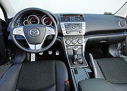 A forgalomban osztatlan tetszést arat a 6-os, a mély, grafitszürkés szín azonban nem áll valami jól neki. Nyugodt felületek és pengeéles ívek teremtenek feszültséget a karosszérián, a rövid túlnyúlások és a merészen emelkedő övvonal pedig dinamizmust sugároz. A vezetési környezet látványos és kellemes, de azért néhány olcsó részlet becsúszott az egyébként minőségi összhatásba. Ilyen a középkonzol alsó részét borító műanyag, illetve az ülésfűtés kapcsolói. A nagy újdonságnak a CF-Net kezelőrendszer számít: a második, TE felszereltségtől fogva a kormányról vezérelhető az audiorendszer, a fedélzeti számítógép, sőt, automata légkondicionáló esetén a befújt levegő iránya, erőssége és hőmérséklete is. Kár, hogy a vékony központi kijelző elég túlzsúfolt, az aprócska ábrák leolvasása pedig nehézkes. A helykínálat korrekt, négy felnőtt kényelmesen elfér az autóban, az apró holmikat viszont csak az elöl utazók tudják kényelmesen elhelyezni. Hátul meglehetősen részletszegényre sikeredett a Mazda, az ajtókon nincs zseb, s szellőzőrostély sem jutott oda, mindössze a kartámaszba integrált pohártartók nyújtanak némi vigaszt.
