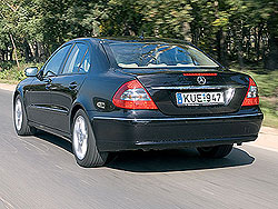 Minden jel arra mutat tehát, hogy itt aztán lesz nemulass! Amikor határozottan kezeljük a gázpedált, az E-osztály be is váltja a hozzá fűzött reményeket: hátsó kerekeivel szinte fel akarja tépni az aszfaltot, elemi erővel rugaszkodik el, majd eszeveszett vágtába kezd . Sportkocsikat megszégyenítő módon 6,1 másodperc alatt katapultál százra az 1,9 tonnás nehézbombázó. Ugyancsak lélegzetelállító, ahogyan nagy sebességről gyorsít tovább, autópályán például a legcsekélyebb erőlködés nélkül éri el elektronikusan korlátozott 250 km/órás csúcssebességét. Az örömmámor egészen addig tart, amíg nem válik túl kanyargóssá az út. Nem is a légrugós, adaptív lengéscsillapítású futóműben van a hiba, hiszen három program (komfort, normál, sport) közül, gombnyomásra választhatjuk ki az éppen megfelelőt. A kormány áttételezését azonban hiába vették