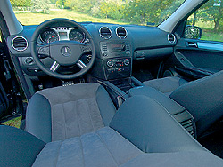 Az M-osztály magasságát először beszálláskor érezni: nem le-, hanem felülünk az ülésre. Onnan aztán nagyon jó kilátás nyílik a forgalomra, emelkedett pozíciónkból több autónyival előrelátunk, így idejében reagálhatunk az eseményekre. Azok pedig már csak azért is gyorsan következhetnek be, mert ötliteres, bő háromszáz lóerős motorjával sportkocsikat megszégyenítően megy a hatalmas vas. A hét másodpercen belüli gyorsulás százas sebességre már sejteti, hogy zöld lámpánál alig akad vetélytársunk, országúton pedig szinte csak villámgyorsan végrehajtott előzések sorozatából áll az utazásunk. Ha akad