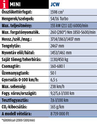 A Mini egyik változatát tekintve sem „észérv-autó”, hanem maga a négy keréken gördülő érzelem. Azzal, hogy a műszerfalon és környékén billenő-, nyomó-, forgó- és léptetőkapcsolók orgiája köszönt a sofőrre, hogy parányi a csomagtér, s hogy négy felnőtt csak nehézkesen fér el benne, egy Mininél ne is foglalkozzon az ember. Van azonban más, ami felett nem lehet emocionális mámor közepette elsiklani – ez pedig a vételár. Ha sorjában vesszük, a Mini One 1,4-es 75 lovas verziója 4 779 000 forintos alappal nyit, ugyanennek az erőforrásnak a 95 lóerős ediciója pedig már 5 070 000 forintba kerül. Az 1,6-os Jolly Joker benzinmotor 120 lovas bázisa (Cooper) 6 028 000, míg a 175 paripával hajtó Cooper S 7 119 000 forintot kóstál. Innen bő másfélmilliós lépcsőt leküzdve juthatunk el a JCW-hez: az 1,6-os egység legizmosabb tálalásáért 8 719 000 forintot kérnek. Szinte pont annyit, mint az „udvartartásban” elérhető 143 lóerős BMW 318d (8 859 000) limuzinért.