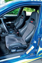 Belül is hasonló a helyzet: mutatós és remek oldaltartást nyújtó sportülések, alumínium pedálsor, továbbá jó fogású, de kissé nagy átmérőjű sportkormány próbálja kendőzni, hogy a tervezők itt sem erőltették meg fantáziájukat, a berendezéshez pedig meglehetősen olcsó anyagokat használtak. Cserében a műszerfal egy szempillantás alatt áttekinthető, a kezelés pofonegyszerű, a gombok és kapcsolók a japánoktól megszokott kifinomultsággal működnek.