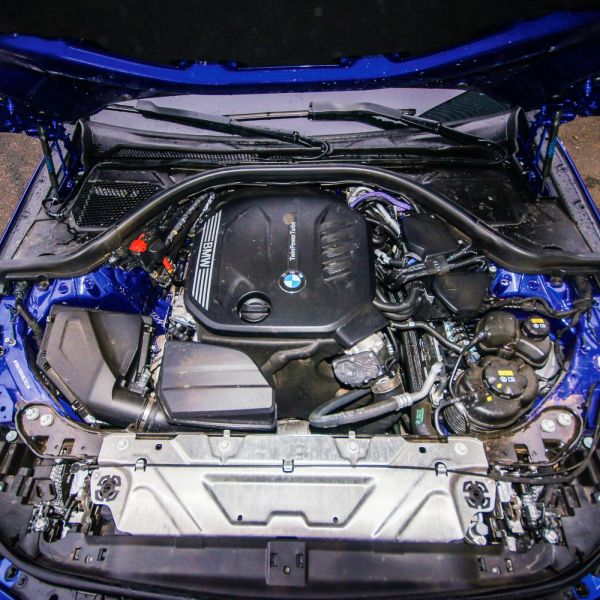 Ez rögtön a vezetési pozícióval indul, a hosszú ajtót feltárva mélyre kell beülnünk, nyújtott lábbal, a padlóhoz közel foglalunk helyet a jó oldaltartású sportülésekben, a vastag, megformált karimájú kormányt közel lehet húzni. Sötétben még hatásosabb az egész, hiszen a hangulatvilágítás nemcsak a hagyományos fényeket jelenti, hanem az ajtókárpiton látható, az M színeit felvonultató motívum is meg van világítva hátulról – pazar! Persze az M sport csomag felára is az (1 688 500 Ft), de a lendületesebb lökhárítók és a látványos hangulatfény mellett többek között sportfutóművet, változó áttételű kormányzást is kapunk, és végül is ezekről szól ez az egész autó. A második sor a fej- és lábtér tekintetében is csak szimbolikus. A motortérbe a régi ismerősnek számító 2,0 literes, négyhengeres turbódízel kerül, amelynek a munkáját egy 11 lóerős indítógenerátor is segíti. Utóbbiból annyit érzékel a sofőr, hogy az alapnak számító Comfort menetprogram azt nyújtja, amit pár évvel ezelőtt még a takarékos Eco Pro: gázelvételre vitorlázni kezd az autó. Aztán a következő alkalommal azt tapasztalja, hogy mégis van némi lassulás. Az egyhetes együttlét során nem sikerült felfedezni rendszert abban, hogy mikor lesz szabad gurulás vagy épp lassulás a válaszreakció, vélhetően összefüggésben van a lágyhibrid rendszer energiaellátását biztosító 48 voltos akkumulátor töltöttségével – a lassulás az energia- visszatermelésnek köszönhető –, de erről nem informál a műszeregység. Aztán itt van a tétova indulás álló helyzetből. Eltelik vagy 1 másodperc, mire ténylegesen mozgásba lendül az autó – életre kel a motor, fokozatba kapcsol a váltó és hajrá –, ami a hosszú orr miatt amúgy is nehézkes mellékutcából való kikanyarodást tovább bonyolítja. Mindez arra készteti a sofőrt, hogy a Dynamic módban elérhető egyedi beállításokkal megszabaduljon az autó működésének spórolós elemeitől.