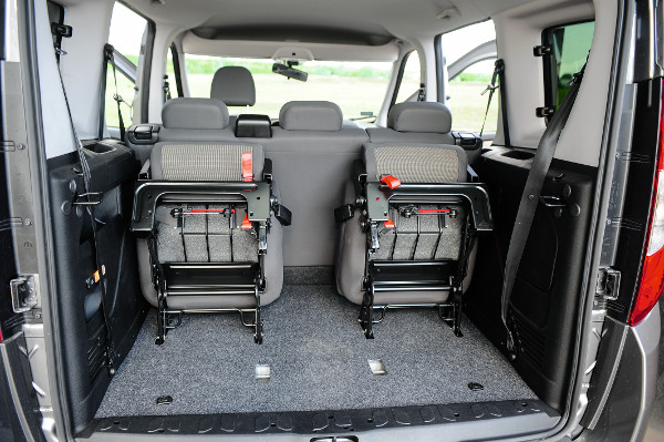 A teherautós rokonság pozitív hatása a nagy méretű külső tükör, de azért nem kell erre hagyatkozni tolatáskor, hiszen hátsó kamera és parkolóradar is választható, sőt melegen ajánlott azoknak, akik sokat parkolnak szűk helyen. A tágasság érzése csak az első üléssorra igaz, a másodiknál már erősen függ a lábtér mérete attól, milyen nagyra nőtt az elöl ülő ember. Erre egyébként van megoldás, a 30 (!) centivel nyújtott tengelytávolságú karosszéria; ha netán függőlegesen nem elég a hely, magas tetőt is lehet rendelni a rövid karosszériához. Extraként két pótülés is kérhető a csomagtartóba, ezek kényelmesek, de aki ide kényszerül, annak a lábfej elhelyezésével lesz problémája. A ki- és beszereléskor sokat kell szenvedni azzal, hogy minden bekattanjon a megfelelő helyre, illetve nagyon nehezek is ezek az ülések, óvatosan tessék emelgetni őket! Ráadásul ezek az ülőhelyek szinte teljesen megtöltik a csomagteret, úgyhogy alaposan gondolja meg mindenki, megéri-e a 180 ezer Ft-os beruházás.