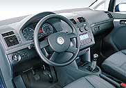 Ami a Volkswagen Touran formavilágát illeti, abba nem sok szellemes vonás szorult, inkább a németesen feszes stílust követi. Ugyanakkor az utastérben valódi ötletbörze kezdődik: például az első ülések támlájának hátuljáról reggeliző asztal hajtható fel. Azután a második, három egyenrangú székből álló üléssor sínen csúsztatható előre-hátra, támlájukat előrebuktathatjuk (a középső ülés így könyöklőként és asztalként egyaránt funkcionálhat), továbbá össze is hajtogathatjuk, s szükség esetén kiszerelhetjük őket. Felár ellenében további két ülőalkalmatosságot rendelhetünk, melyek – használaton kívül – az Opel Zafiráéhoz hasonló módon a padlóba hajtogathatók. Hárompontos biztonsági öv és fejtámla mindenhová jutott, de hátulra lehetőség szerint csak gyerekeket ültessünk, mivel oda körülményes bemászni, meg aztán itt már a helykínálatot sem felnőttekre méretezték. Aki a Touranban nem tudja elhelyezni apróbb holmijait, annak sokkal inkább utánfutó javasolható. A tervezők ugyanis nem kevesebb, mint 39 pakolórekeszt álmodtak az autóba – találunk légkondicionáló által hűtött dobozt, 12 voltos csatlakozókat, napszemüveg-tárolót, kartámaszt elöl, valamint kisebb-nagyobb üdítők számára italtartót. Hétszemélyes “üzemmódban” meglehetősen szűkös a poggyásztér, ám öt üléssel már 695, kettővel pedig 1913 ill. 1989 liternyi csomagot képes elnyelni (attól függően, hogy megrendeltük-e a pótszékeket). A könnyen kezelhető és esztétikus csomagtérroló a hátsó és a középső üléssor mögé is felszerelhető, ha pedig nincs rá szükség, a csomagtérpadló alatt húzódó rekeszben tárolhatjuk. Hatalmas raktérnyílás és alacsony küszöb segíti a pakolást, ám a két fokozatban állítható ötödik ajtó kissé alacsonyra nyílik, bár kézzel még feljebb lehet tornászni.