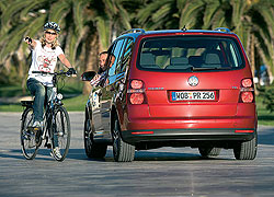 Extrákban is erősödött a Touran, kettő külön is kiemelendő: a statikus kanyarfényszóró, valamint a parkolássegéd. Az utóbbi segédberendezés lelke elöl-hátul két-két infravörös szenzor, valamint az elektromos rásegítésű kormánymű villanymotorja. Ezek összehangolt és irányított munkája eredményeként parkoláskor kiiktatható a saját kezű kormányzási manőver. Az asszisztens gyakorlati működéséhez a járműnél elöl és hátul 70 centiméter, vagy nagyobb helyre és párhuzamos helyzetre van szükség. Jobbról balra és balról jobbra is képes beállítani az autót egy parkolóhelyre, a sofőrnek csak egy aktiválógombot kell megnyomnia a kézifékkar előtt, majd finoman gázt adnia és a radar hangjelzését figyelnie, végül pedig a kellő pillanatban fékeznie. Aki a fékezést elmulasztja, könnyen letesztelheti a lökhárítók koccanástűrő képességét…