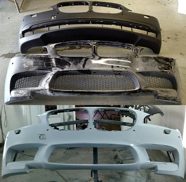 Ehhez egy, a márkaszervizben is megvásárolható BMW 7-es lökhárítót vásároltak, és sikerült szerezni egy használt, de jó állapotú aktuális M5 első lökhárítót is. Ezek után már csak az LTBMW szakembereinek kézügyességére volt szükség, hogy a vízszintesen félbevágott 7-es (felső rész) és M5-ös (alsó rész) lökhárítót ügyesen összeillesszék, ami sikerült is, így gyári alkatrészek felhasználásával elkészült az M7-es első lökhárító.