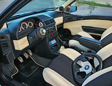 Az utastérben szinte semmi nem maradt az eredetiből. Feketére cserélték a műszerfaltömböt, új a tetőkárpit, az első ülések pedig Subaru Impreza WRX STi modellből származnak. Beszereltek kiegészítő műszereket és vágott aljú, levehető sportkormányt. Nem maradtak el a Momo pedálok és váltógomb sem. Az üléseket és az ajtókárpitokat kétszínű bőrrel húzták át. Persze komoly hifit is beszereltek: a fejegység JVC, elöl külön fészkekben egy háromutas rendszer dolgozik Vifa és Morel sugárzókkal, amelyeket HiVi hangváltó vezérel és 4 csatornás Sony erősítő hajt. A csomagtartóban üvegszálas és fényezett környezetbe beépített 38 cm átmérőjű mélynyomó dolgozik, amelyet monoblok erősítő hajt. Kapott a rendszer kondit is, és a csomagtérajtóra szerelt 15 colos monitort. A jobb hangzásért mindent szigeteltek, csak az ajtókba 15-15 méter bitumenlapot szuszakoltak be!