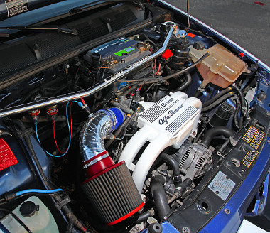 Belül is alaposan átépítették a boxert, alig maradt régi alkatrész Felfúrták a hengereket, új hajtókarokkal, s egyedileg készített dugattyúkkal rakták össze a motort. A hengerűrtartalmat 1,6 literre növelték, és a nagyobb motorról szerelték át a nagyobb hozamú injektort is. A kipufogórendszer is egyedi, rozsdamentes acélból szabták. A szívóoldalt direktszűrővel látták el, fehérre festették a szívócsonkot, amit lehet, políroztak. A gép teljesítménye 100 lóerő fölé nőtt, ám ez nem túl acélos. Meglepetéssel a beszerelt nitro-rendszer szolgál, amelynek tartálya a csomagtartóban lakik. A 35-ös fúvóka annyi gázt fúj be, amellyel helyből jó 40 lóerővel lehet megfejelni a teljesítményt: igaz, rövid időre és csak 2000-6000-es fordulatszám-tartományban használva a motort.
