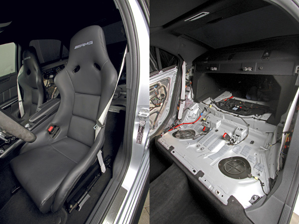 A teljesítmény növelése csak az egyik része a tuningnak, a másik a tömeg csökkentése. Egyfelől néhány csavarozható karosszériaelemet karbonból készített darabra cserélnek, de ennél sokkal nagyobb megtakarítást jelent, hogy megszabadulnak a hangszigeteléstől meg úgy nagyjából mindentől, ami az utastér hátsó részében található. A két első ülést a C63 Black Series-ből veszik át, ez ülésenként (!) 40 kg-os megtakarítást eredményez.