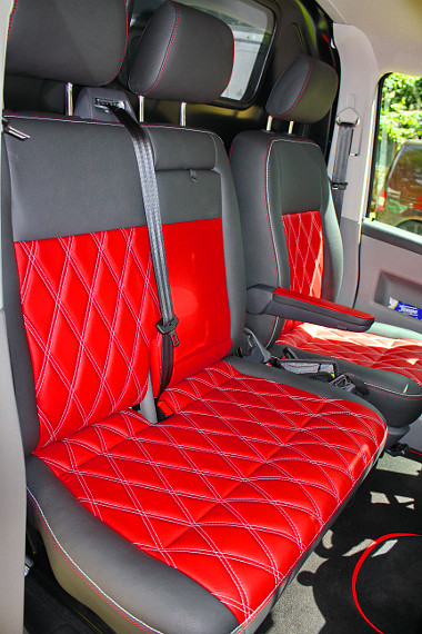 A karfákra is jutott bőrhuzat. Következik a tetőkárpit feljavítása. Fotó: Dombóvári Mihály Minthogy egy Transporter szép nagy darab autó, így elsődleges szempont volt a jó színválasztás. A ma divatos matt színek közül pirosat választottak, emellé feketét és fehéret is bevetettek. Felszereltek új, jel nélküli hűtőmaszkot, amelyet fényes feketére fényeztek. A nagy felületekre az amerikai Vossen Wheels dekorációját szabták, illetve hátra, valamint az ajtókra a versenysportban szokásos szponzorlogókat ragasztották fel fehér betűkből. A jó hangulatért készült pár kiegészítő is a T5-öshöz: összeraktak fehérpiros dekorációval egy bringát, amely szintén országúti, akárcsak az autó, amely a tetején viselheti. Szintén ide való a pirosra fóliázott, fehér díszítésű tetőbox is.