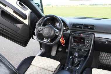 A fóliázáskor eltüntették a csomagtartó emblémáit és feliratait, aztán fekete-fehér bőrrel átkárpitoztatta az üléseket és az ajtóburkolatokat. A fekete részeken fehér cérnájú díszvarrás, a fehér felületeken steppelés emeli a nívót.