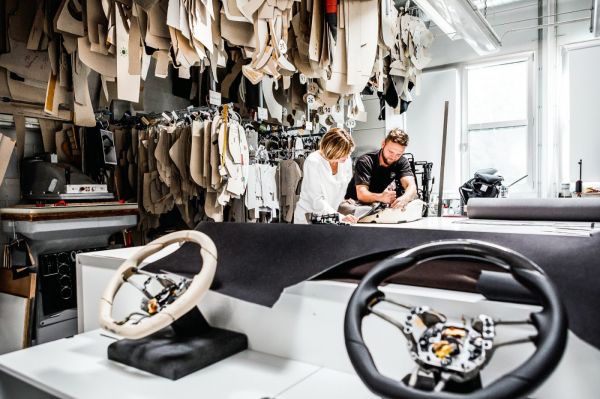 Az első és legfontosabb lépés az alapanyag kiválasztása, itt bevonja a TechArt a megrendelőt is, hiszen ő tudja, milyen környezetbe képzeli el magát a Porschéja fedélzetén. De sokszor fogni kell a kezüket, mert ízlés nem terem minden fán. Ezt a feladatot segíti, hogy a bőrmintákat összevetik a kárpitokkal, így a színharmóniát, az anyagtípusok együttélését tudják bemutatni. A kárpitanyagok is sokfélék, a legfinomabb bőrtől az Alcantarán át a különleges textilekig. A kormányok, vagy a váltógombok érintőfelületei is többfélék lehetnek, bőr, fa, karbon, vagy akár alumínium. És persze az egész összeállításnak passzolnia kell az alkalmazott dekorelemekhez is, ami szintén lehet fa, karbon, alumínium, szálcsiszolt fém, vagy éppen lakkozott felület. Így közel annyit morfondíroznak egy-egy variáló vevővel, mint amennyi idő alatt elkészül az egyedi sportkormány.