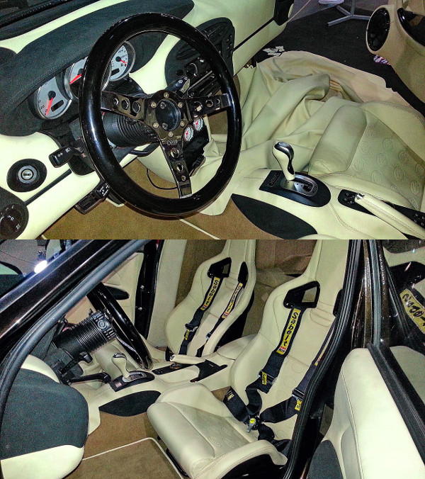 OMP sportkormány mögött Porsche műszeregység. A Porsche ülések maradtak a négypontos övekkel. Minden bőrbe dombornyomták a Bara-emblémát Bármennyire is Opelnek tűnik, a lemezek alatt már nem villámemblémás furgontechnika, hanem egy megskalpolt Porsche Boxster rejtőzik! 2014-et írtunk, mikor Baki Peti jelezte, hogy a látókörébe került egy totálkárosra tört, keveset futott Boxster. Az autót megszerezték, így a tavalyi hungaroringi Opel Családi Nap után újra szétdöntötték a Combót. A feladat nagy volt: beszabni a Combo felépítmény alá a Porsche padlólemezt minden szerelékével. A küszöbök közötti szélességkülönbség mindössze 1 cm volt, így haladósnak ígérkezett a munka. Ám a Porschén az első doblemezek használhatatlanra deformálódtak, így kellett még egy üres Porsche kasztni. Ez is meglett, így beszabhatták a doblemezeket, de a rugótornyokat a Combo adta. Bő fél évig tartott a lakatolás, ebben benne volt a sárvédők szélesítése, a Porsche padló beszabása, bölcsőkkel, futómű-bekötési pontokkal együtt. Laci a Combo eredeti motorját-váltóját eladta, egyszerűen nem volt rá szükség, hiszen a 29 000 km-t sem futott hathengeres Porsche boxermotor az automatikus váltóval ütősebb kombinációt ígért. A motor természetesen hátra került, a puttony alá, de szép motorházba illesztve. Ráadásként készítettek hozzá rozsdamentes acélból szabott és polírozott sportkipufogót, majd sportlégszűrőt is kapott, a légkondit viszont lecsatolták róla.