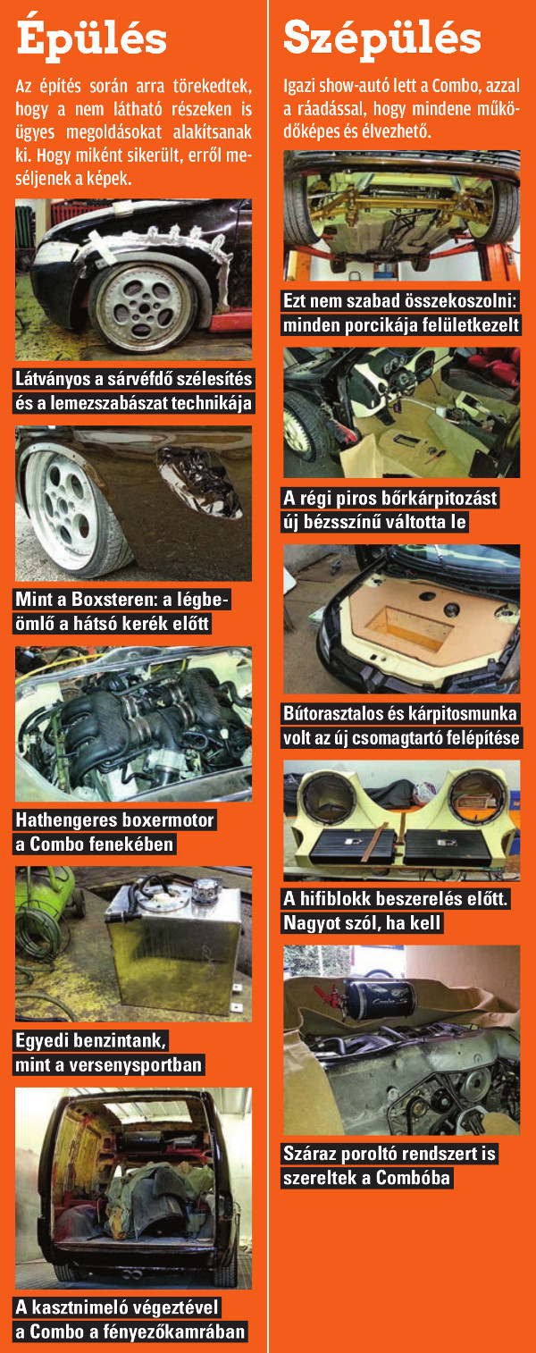 Mi ez? Varrógéphajtású futárkocsi? Majdnem, a jó megoldás: „Porsche-hajtású őrült Combo”. Fotó: Bara Kárpit, Tóth László Rudolf és Dombóvári Mihály Továbbfejlődött az öngyilkos ajtókkal, idegen fényszórókkal, Porsche belső térrel ékeskedő Opel Combo, amelyet Bara Laci „szuperkárpitos” mester birtokol. Pontosabban a birtokjog nehezen meghatározható, mert az egész műhelyszemélyzet, sőt a baráti holdudvar is aktívan részt vett az építésben és a sikerekkel járó ünneplésekben, így igazán egy egész csapat düllesztheti a mellét az autó mögött.